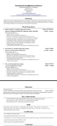 محمود مبروك عثمان مهندس جيولوجي ابحث عن فرصة عمل مناسبة في الاستشارات الهندسيه واختبارات التربة والخرسانة واعداد التقارير المعملية حاصل على بكالوريوس علوم الأرض خبرة عملية في الهندسة الجيوتقنية، وتحليل خواص التربة والصخور لتحديد صلاحية المواقع الانشائية والعمل ضمن فرق استشارية لمشاريع بنية تحتية، مبان سكنية، صناعية وتجارية. استخدام برامج متخصصة في معالجة بيانات الاختبارات مثل GeoSystem MS Office