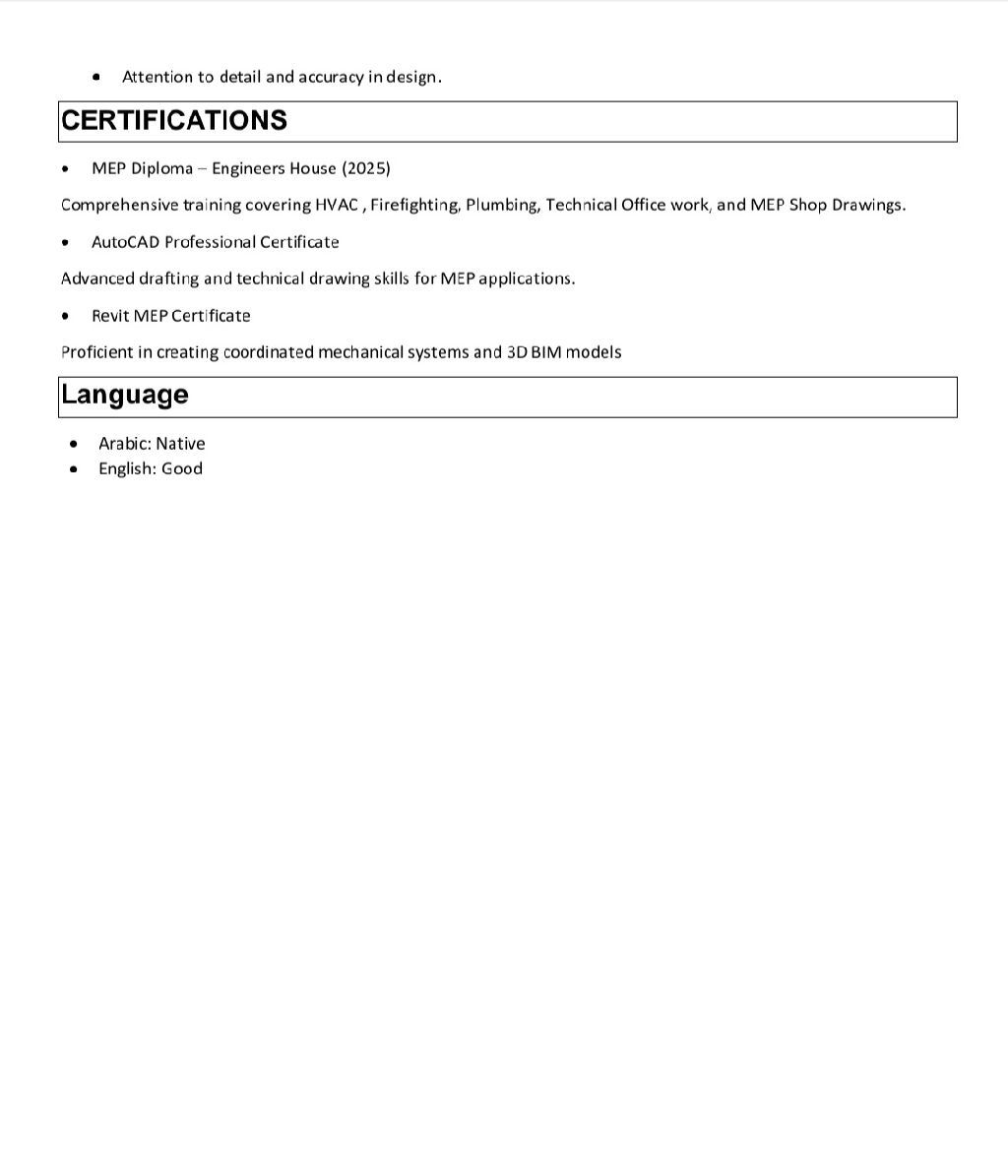 مهندس ميكانيكا حديث التخرج لدى خبرة تدريبية في مجال mep واعمل على برامج cad & Revit موجودة في القصيم معي إقامة سارية وقابلة لنقل الكفالة
