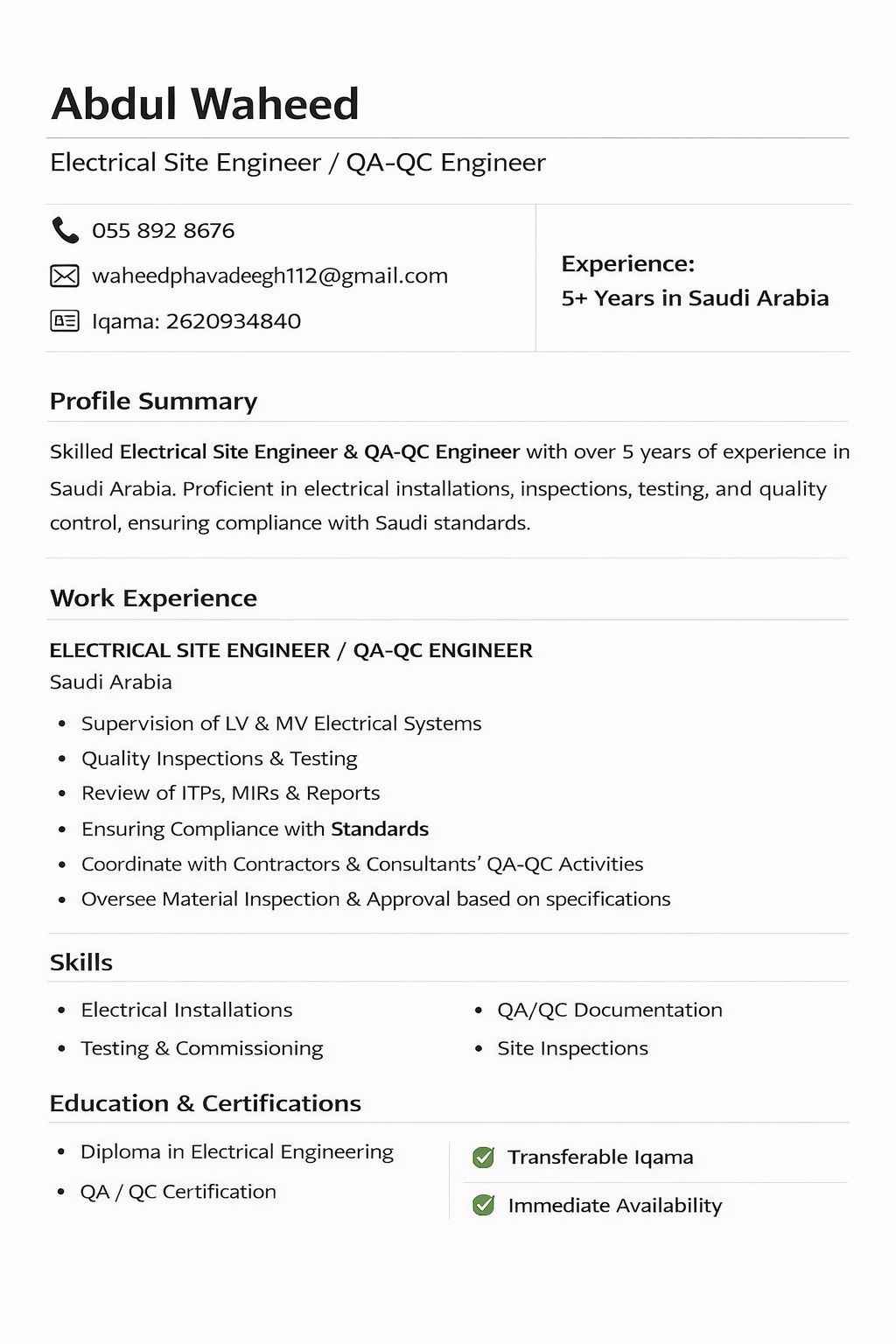مهندس مواقع كهربائي محترف يمتلك خبرة 5 سنوات في العمل داخل مواقع الانشاء ودعم تنفيذ المشاريع. متواجد في جدة وجاهز للمباشرة فورا. امتلك اقامة قابلة للتحويل ورخصة قيادة سارية. قادر على متابعة أعمال الموقع، دعم أعمال التركيب، التنسيق مع الفرق، وضمان تنفيذ المهام حسب المواصفات. ملتزم، منظم، ويحرص على تحقيق سير عمل ميداني فعال ومنظم