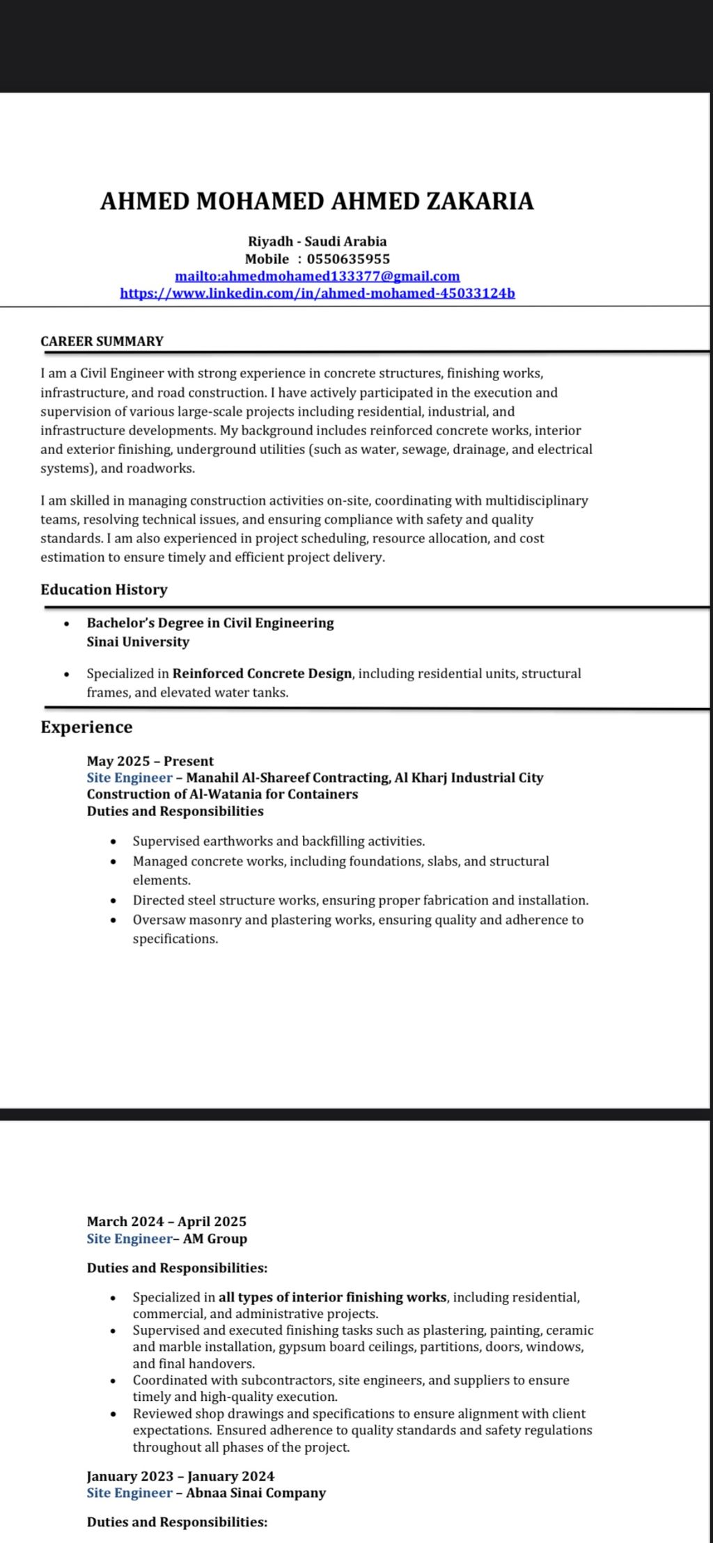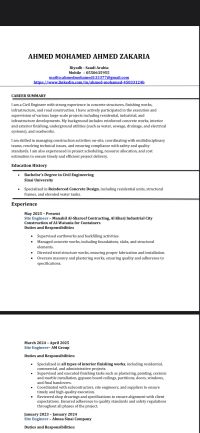 أنا مهندس مدني خبرة 5 سنوات في مجال الخرسانات والطرق والبنية التحتية والأستيل والتشطيب الداخلي والخارجي