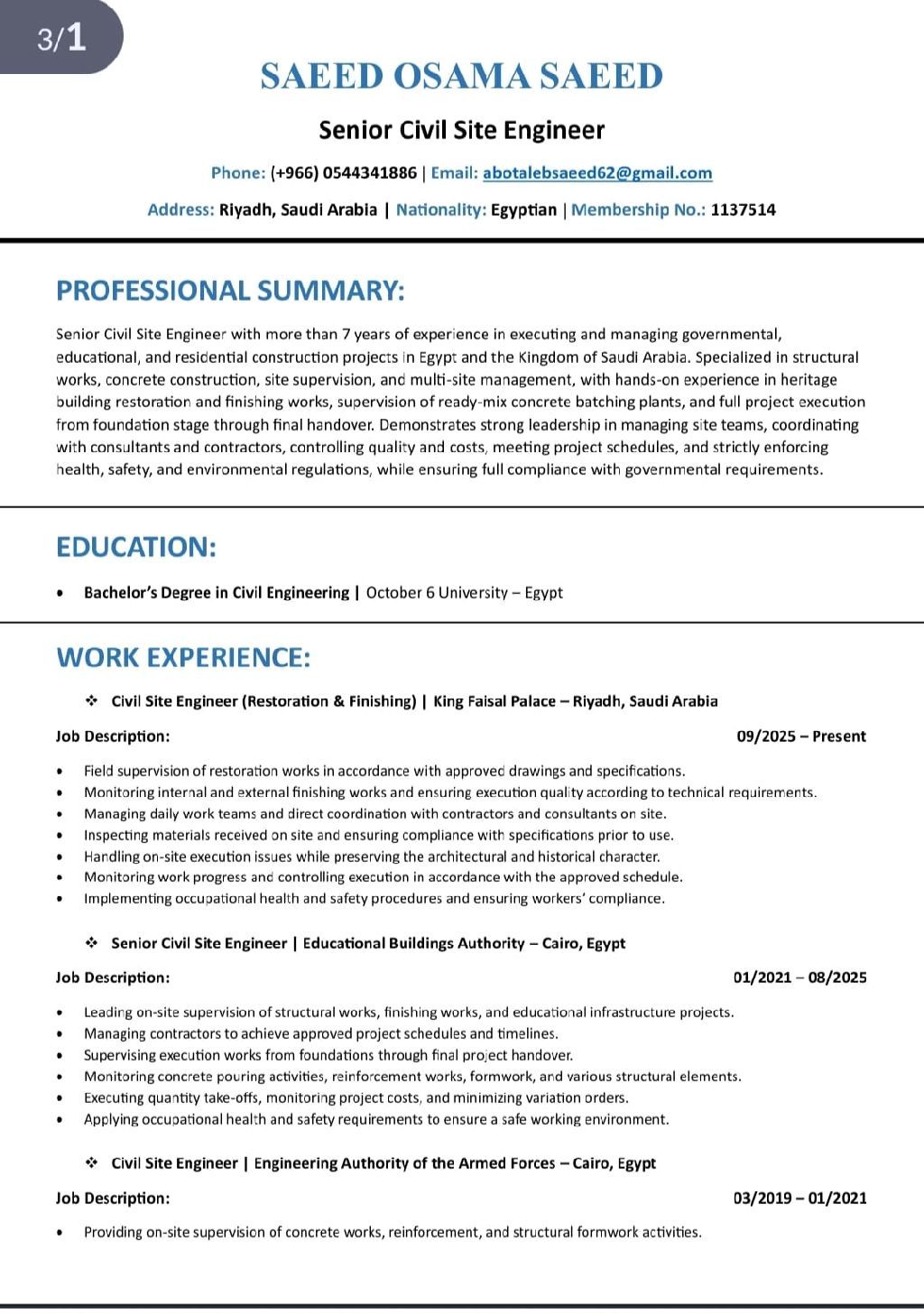 مهندس مدني موجود في الرياض خبرة 7 سنوات خبرة في التنفيذ والاشراف على تنفيذ أعمال الخرسانة المسلحة وأعمال العزل والمباني والتشطيبات خبرة في إدارة الموقع والمقاولين والعمال وضبط الجودة اسهمت في انشاء عدد 20 مدرسة تعليمية ومباني سكنية عدد 34 مبني سكني في مشروع أه إلينا معي إقامة سارية ومسجل في الهيئة السعودية للمهندسين خبرة في أعمال الخرسانات والتشطيبات جاهز للعمل