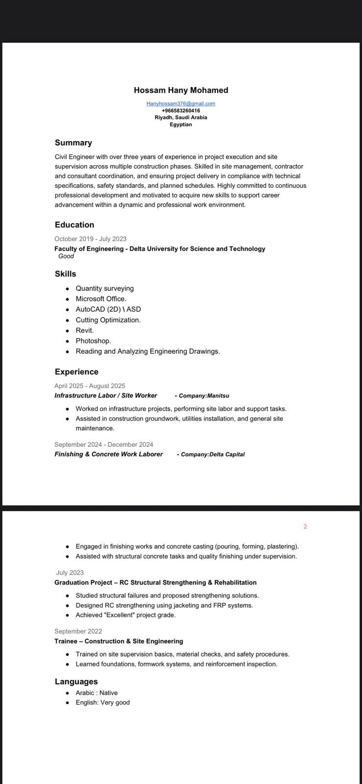 مهندس مدني خبرة 3 سنوات ابحث عن فرصة عمل في مجال الهندسة المدنيه اجادة العمل علي برامج أل AutoCAD وExcel ومعرفة جيده بالرسومات الهندسيه وحصر الكميات المام بأساسيات الاشراف الرغبة في التعلم مجال العمل المطلوب شركات مقاولات مكاتب استشارية مواقع التنفيذ متاح للعمل والإقامة سارية لمدة عام من الآن للتواصل رقم التلفون البريد الألكتروني