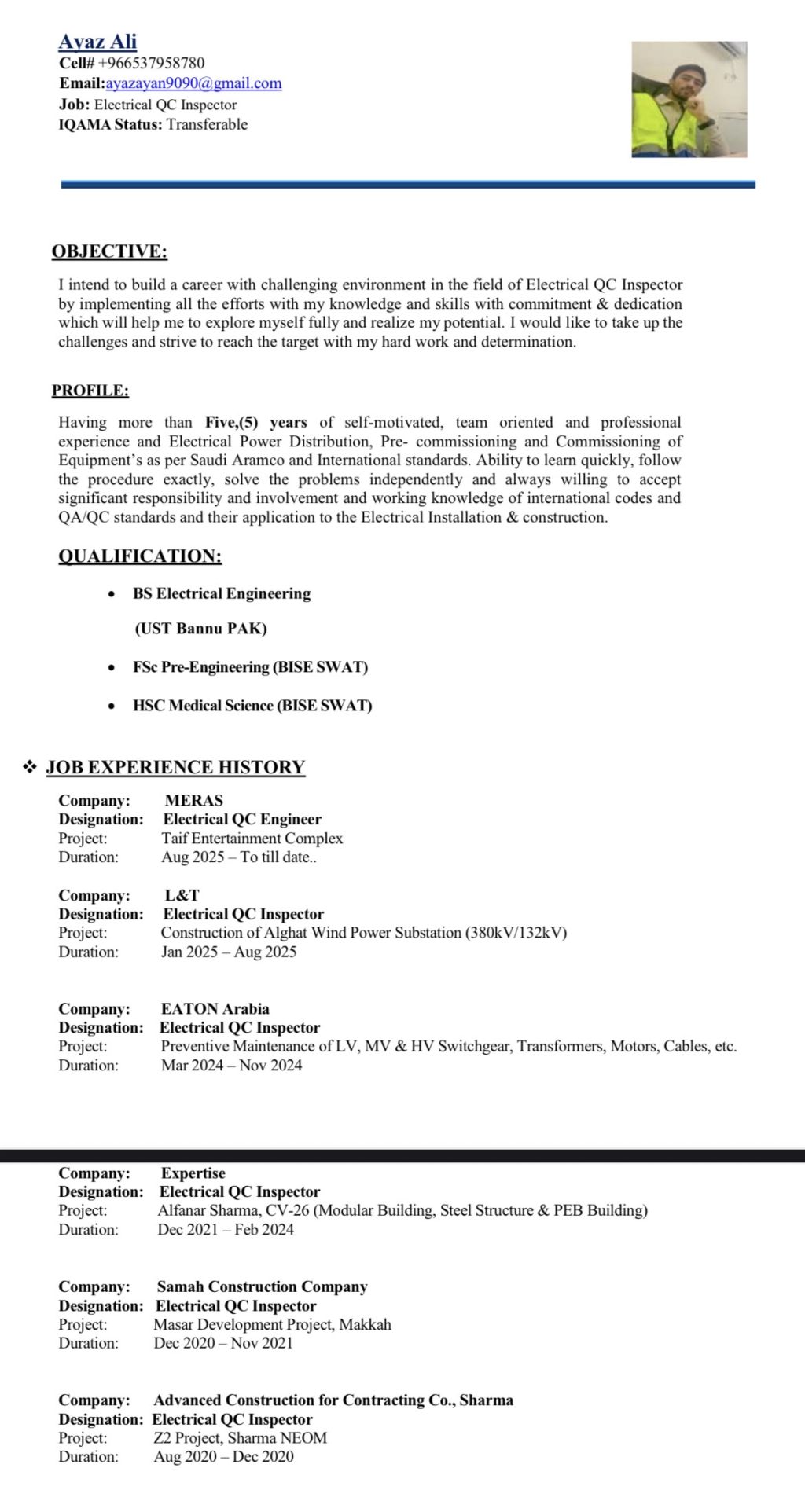 I am a Bachelor’s degree holder in Electrical Engineering with 5 years of experience as an Electrical QC Engineer/ Inspector in the Kingdom of Saudi Arabia. I am currently looking for a suitable vacancy/ job opportunity in electrical quality control