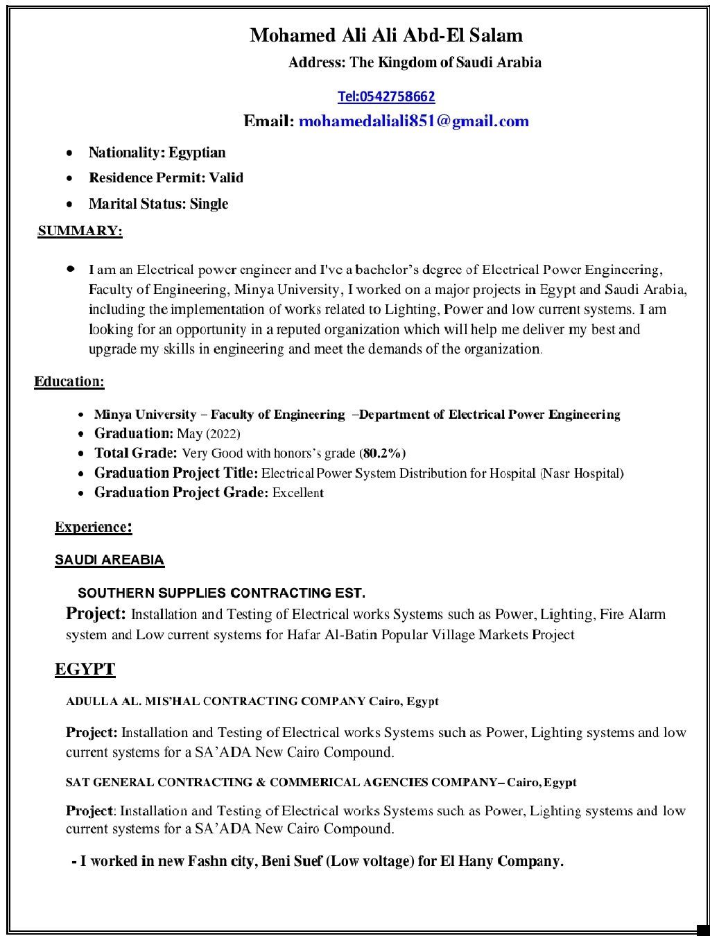 مهندس كهرباء باور مقاولات - تنفيذ وتصميم (Lighting - Power - Low Current) خبرة 3 سنوات في أعمال التنفيذ بالموقع والتصميم اجادة لبرامج أل Dailux, Dialux Evo, Etab, CAD والبرامج التصميمية المختلفة أعمال الحصر للأنظمة الكهربائية والشوب دروينج وas built جاهز للانضمام الى فريقكم فورا متاح نقل كفالة