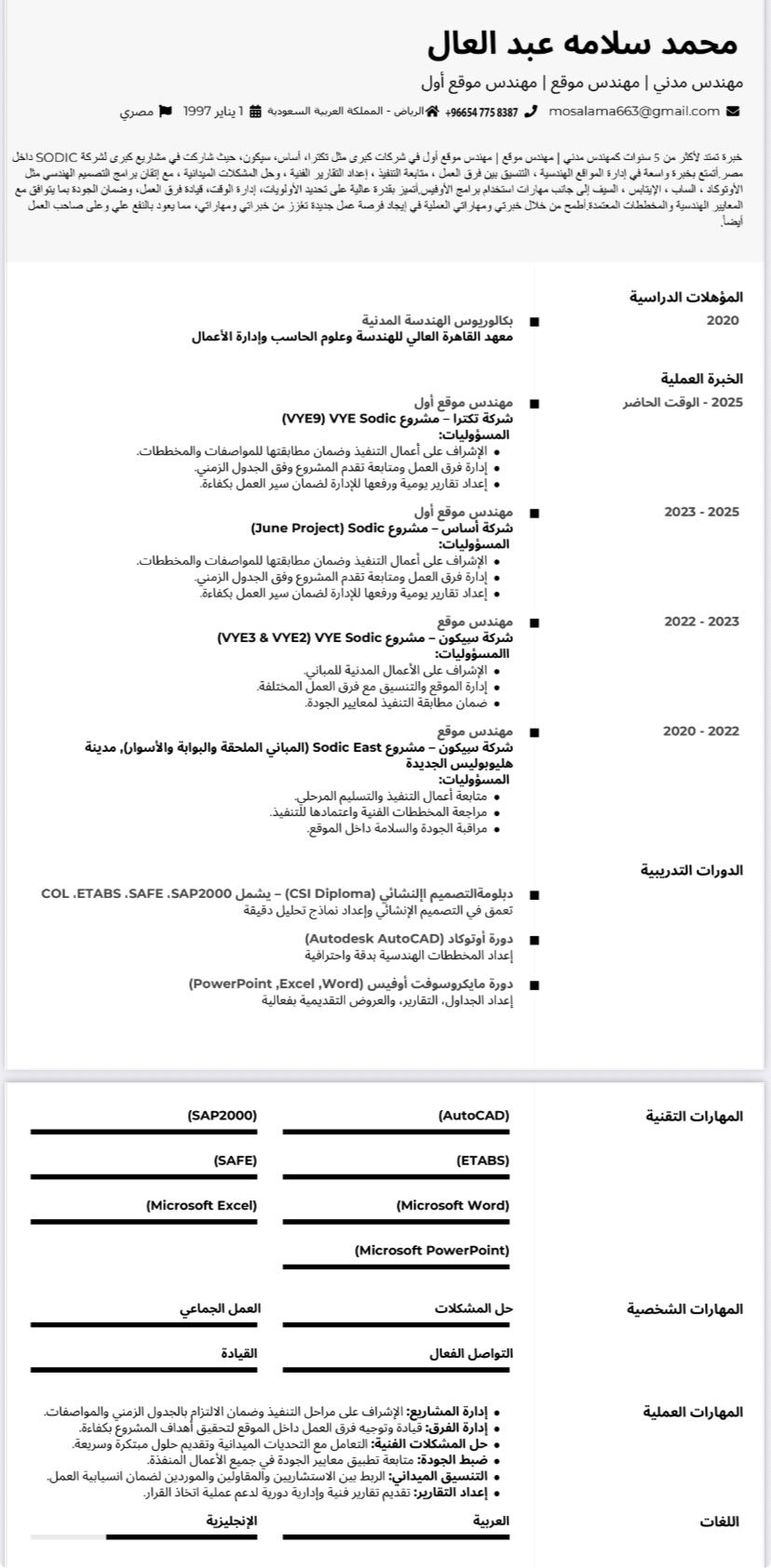 مهندس مدني تنفيذ مصري الجنسية أقيم في الرياض خبرة أكثر من 5 سنوات في أعمال الخرسانات والتشطيبات عملت في مشروعات كبري في مصر مثل Sodic East, VYE Sodic, June Sodic حاصل علي عضوية الهيئة السعودية للمهندسين لدي اقامة سارية وجاهز للعمل فورا