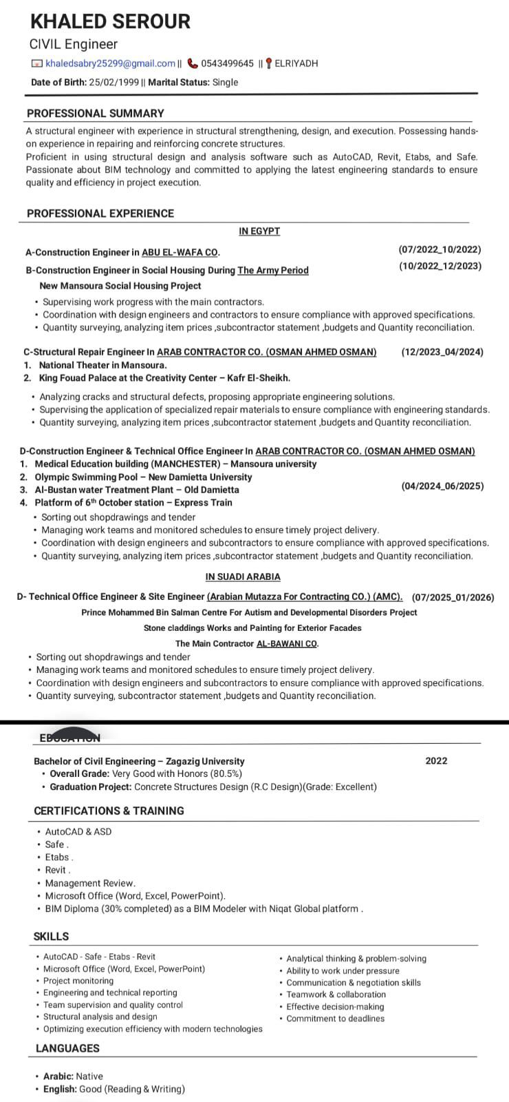 مهندس مدني (مصري) خريج جامعة حكومية - الزقازيق - دفعة 2022 تخصص تصميم المنشاءات الخرسانية تقدير تراكمي جيد جدا مع مرتبة الشرف ومتمكن من برامج التصميم الانشائي خبرة 3 سنوات في شركة المقاولون العرب أعمال تنفيذ المنشاءات الخرسانية المختلفة وخبرة 1 سنة في السعودية في التشطيبات الداخلية والخارجية ومتمكن من قراءة المخططات الانشائية وأعمال المكتب الفني من حصر الكميات وتحليل أسعار البنود وعمل المستخلصات