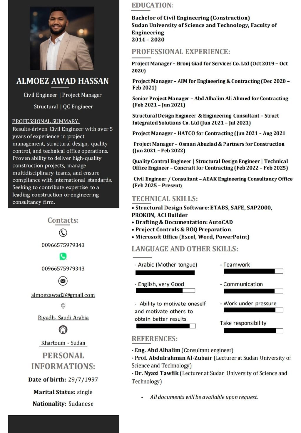 مهندس مدني بخبرة تتجاوز 6 سنوات في إدارة المشاريع، التصميم الانشائي، وأعمال المكتب الفني. قدت وشاركت في تنفيذ مشاريع نوعية وحكومية كبرى مع تحقيق أعلى معايير الجودة والالتزام الزمني. ابحث عن فرصة وظيفية ضمن جهة طموحة أكون فيها شريكا في النجاح للتواصل (واتساب - اتصال)