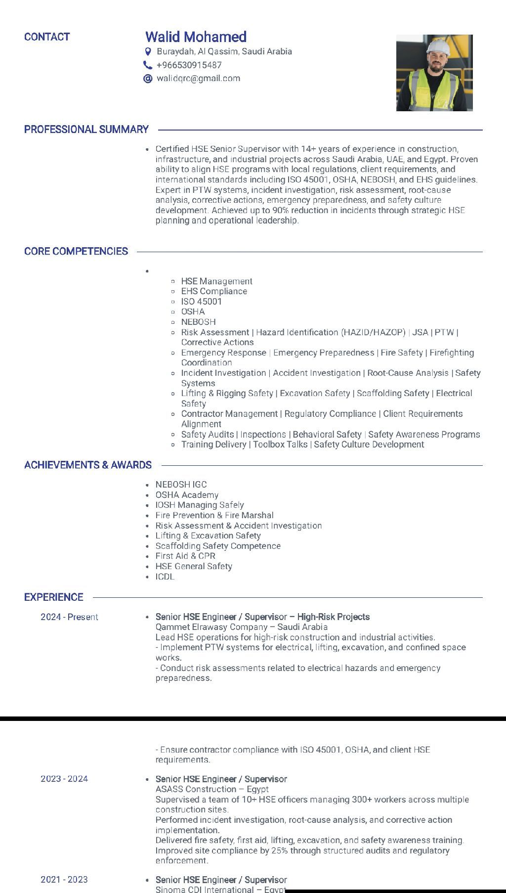 مسؤول أمن وسلامة بخبرة 14 سنة في (السعودية / الامارات / جورجيا / نيوزلاند) أتحدث اللغة الانجليزية بطلاقة والعمل علي الحاسب الآلي ولدي شهادات دولية معتمدة (NEBOSH / IOSH/ ISO 45001/ NFPA/ Lifting/ OSHA/ Firefighter/ Scaffolding) خبرة في الادارة والعمل الميداني والتدريب واعداد الخطط
