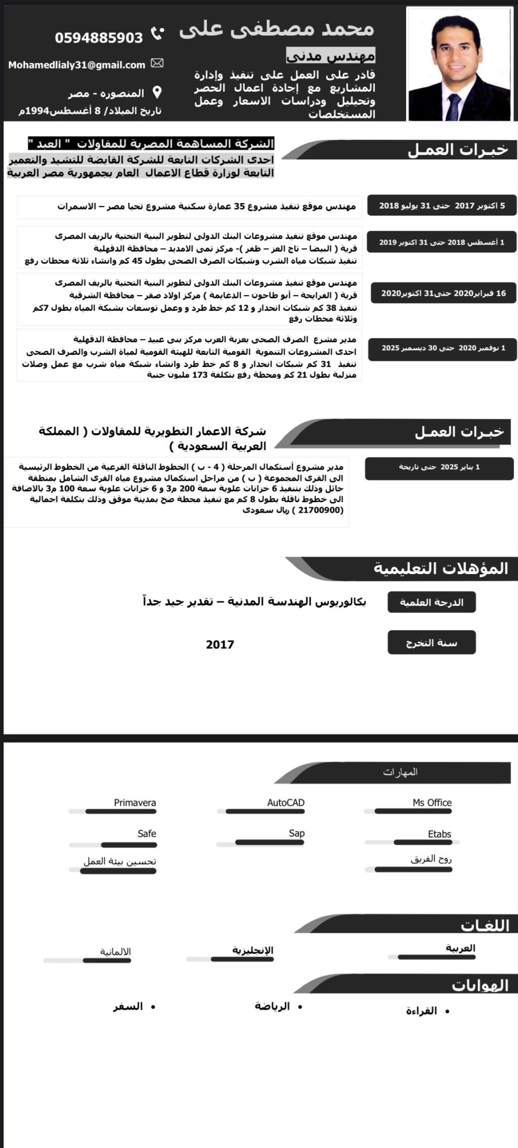 مهندس مدني خبرة 9 سنوات ابحث بشكل جاد عن فرصة عمل مناسبة في مجال إدارة المشاريع أو الاشراف. خبرة قوية في مشاريع المياه والصرف الصحي والبنية التحتية، والعمل مع شركات حكومية كبرى. اشتغلت منصب مدير مشروع بمشاريع شركة المياه الوطنية، ولدي قدرة عالية على المتابعة والتنظيم والالتزام. متاح للعمل فورا