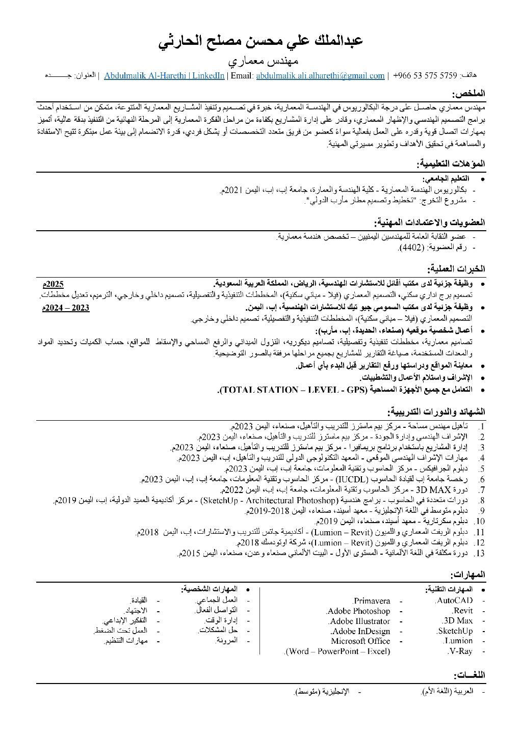 مهندس معماري بخبرة في تصميم وتطوير المشاريع السكنية والتجارية واعداد المخططات التصميمية والتنفيذية، مع اهتمام بالجوانب الجمالية والوظيفية ودقة التنفيذ متمكن من برامج التصميم والاظهار المعماري