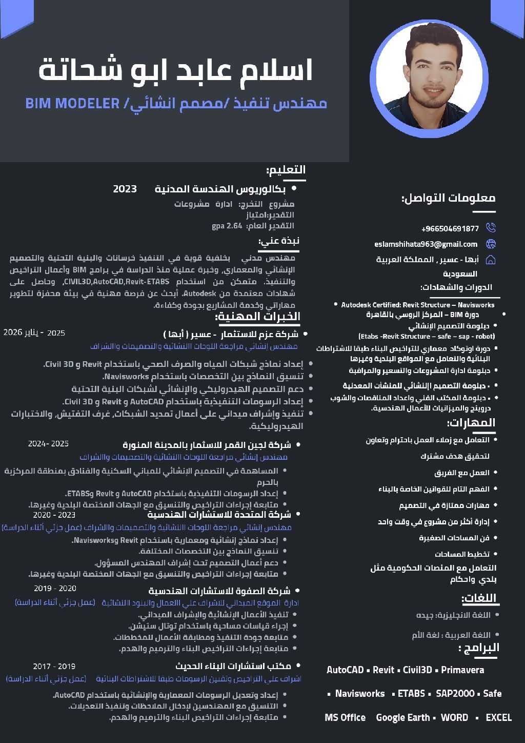 أنا اسلام عابد، مهندس مدني خبرة 3 سنوات اعمل في مجال الإنشاءات والبنية التحتية وشبكات المياه والصرف الصحي، ولدي خبرة في النمذجة والتنسيق باستخدام Revit, Civil 3D, Navisworks اضافة الى خبرة في التنفيذ الميداني لشبكات البنية التحتية. كما امتلك خبرة في التصميم الانشائي والمعماري واعداد الرسومات التنفيذية باستخدام AutoCAD وRevit وETABS. ابحث عن فرصة مناسبة