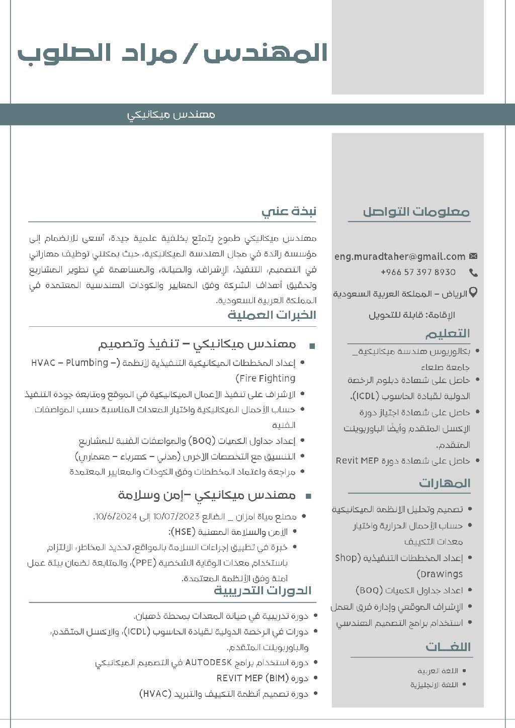 مهندس ميكانيكي حاصل على شهادة البكالوريوس في الهندسة الميكانيكية، مقيم في الرياض. امتلك خبرة جيدة بالأنظمة الميكانيكية وأنظمة التكييف (HVAC) اعداد المخططات التنفيذية، حساب الأحمال، احترافية باستخدام برامج SolidWorks, AutoCAD، HAP, وRevit MEP، وأيضا برامج المايكروسوفت، وأسعى لفرصة عمل مناسبة لتطوير مهاراتي والمساهمة في نجاح جهة العمل