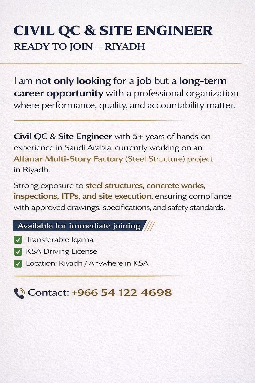 أنا لا ابحث فقط عن وظيفة بل عن فرصة مهنية طويلة الأمد مع جهة احترافية. مهندس موقع وضبط جودة مدني بخبرة أكثر من خمس سنوات في المملكة العربية السعودية، اعمل حاليا في مشروع مصنع الفنار متعدد الطوابق (هيكل فولاذي وخرساني) متمرس في التفتيش وITP وتنفيذ الموقع، جاهز للانضمام فورا مع إقامة قابلة للنقل ورخصة قيادة سعودية، للالتزام بالجودة والسلامة وتحقيق متطلبات المشاريع