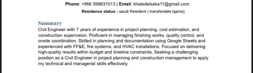 مهندس مدني خبرة 7 سنوات في التنفيذ والاشراف علي المشاريع الخرسانية والاشراف علي التشطيبات الداخليه والخارجية وحصر الكميات متواجد في الرياض ويوجد إقامة قابلة للنقل ولا مانع من التنقل لأي مكان في المملكة