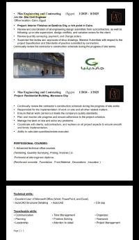 مهندس مدني جامعة المنصوره لدي خبرة أربع سنوات في أعمال الإنشاءات والتشطيبات والمكتب الفني لدي اقامة سنة وسبق لي العمل في مكتب استشاري في السعودية مشروع طريق الهجرة من مكة للمدينة المنورة