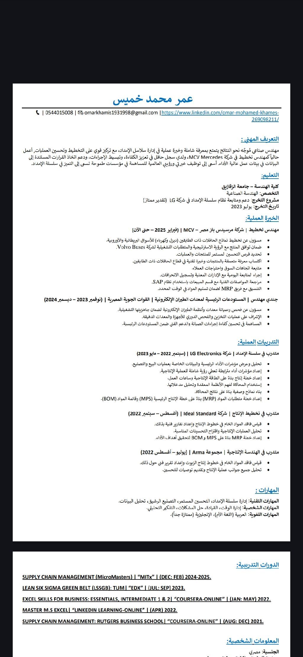 مهندس صناعي موجه نحو النتائج أتمتع بمعرفة شامله وخبرة عملية في ادارة سلاسل الانتاج مع تركيز قوى على التخطيط وتحسين العمليات ولدى سجل حافل في تعزيز الكفاءة وتبسيط الاجراءات ودعم اتخاذ القرارات المستندة الى بيانات بيئات العمل عالية الأداء أسعى الى توظيف خبرتي ورؤيتي للمساهمه في مؤسسات طموحه تسعى الى التميز في سلسة الأمداد