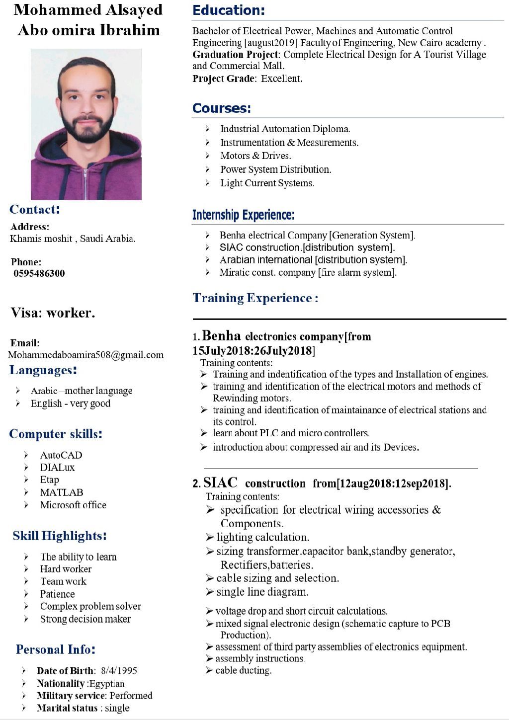 أنا مهندس كهرباء قوى خبرة 6 سنوات عملت بنظام انذار الحريق المعنون وبانارة الطرق وبالعقد الموحد ومسجل بالهيئة السعودية للمهندسين وابحث عن عمل وموجود حاليا بمدينة خميس مشيط