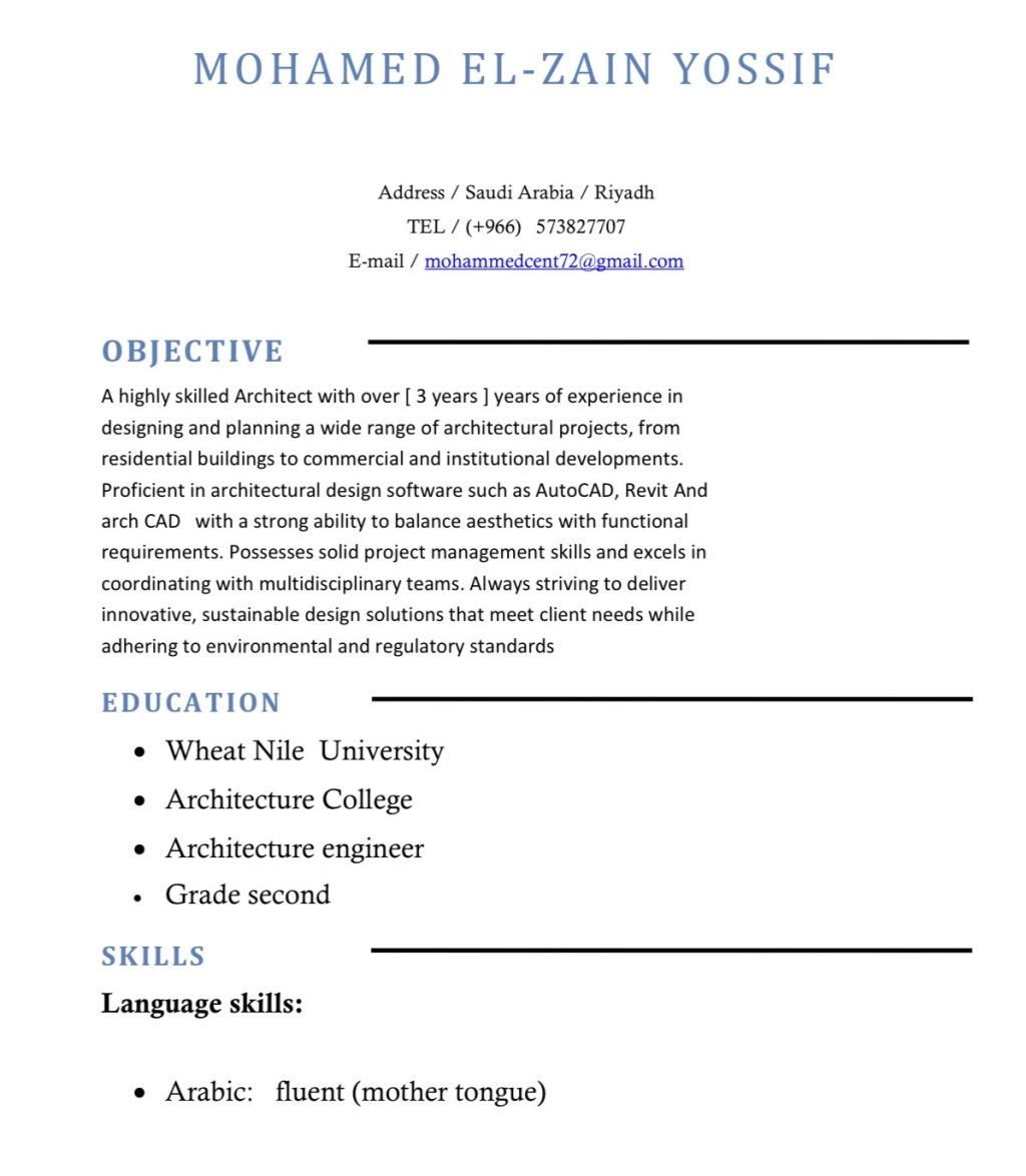 مهندس معماري بخبرة 3 سنوات في مجال التصميم المعماري والاشراف الهندسي على المواقع، امتلك خبرة عملية في تطوير المخططات المعمارية ومتابعة سير الأعمال في المواقع لضمان الجودة، متمكن في برامج التصميم المعماري والرندرة باحترافية مثل (الريفيت - الاوتوكاد - اللوميون - الارشيكاد) أتميز بالقدرة على العمل ضمن فريق، وتحويل الأفكار الى حلول تصميمية