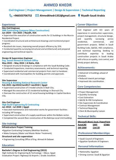 مهندس مدني خبرة 10 سنوات منهم 4 سنوات داخل المملكة في أعمال الخرسانات والتشطيبات والمنصات الالكترونية، مقيم في الرياض - إقامة سارية - رخصة سارية. رقم التواصل