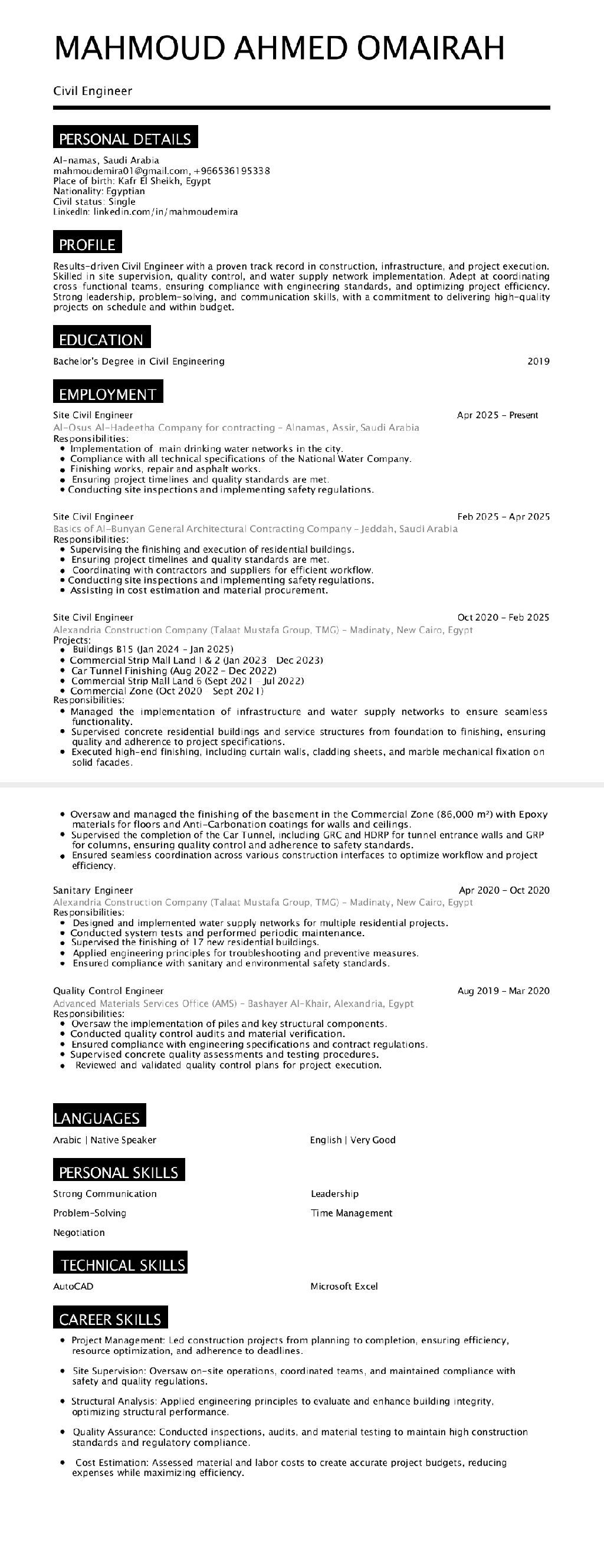 مهندس مدني مصري خبرة 7 سنوات كمهندس تنفيذ، تم العمل بشركة طلعت مصطفى بمشاريع مدينتي 5 سنوات (انشاءات - تشطيبات - بنية تحتية) متواجد في المملكة العربية السعودية من سنة وعضو في الهيئة السعودية للمهندسين، متواجد حاليا في عسير، وجاهز للعمل ونقل الكفالة