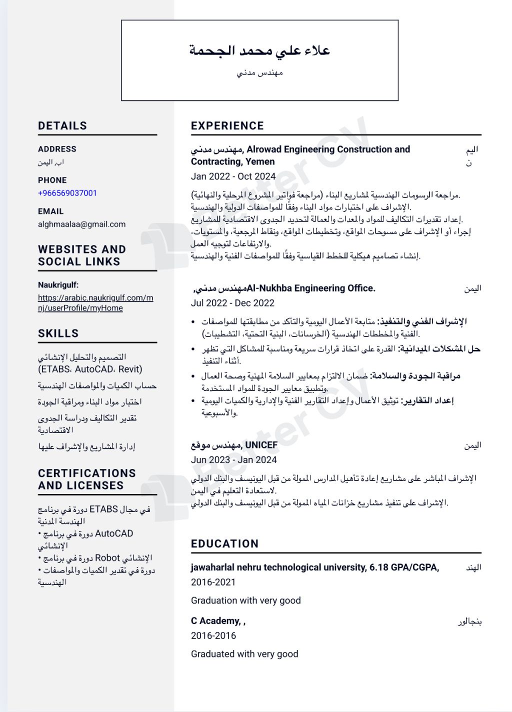 مهندس مدني موقع امتلك خبرة 3 سنوات في الاشراف على مشاريع انشائية وتنفيذ الأعمال وفق المخططات والمواصفات الهندسية. وتنفيذ أعمال الموقع والتنسيق مع الاستشاريين والمقاولين ومتابعة تقدم الأعمال اليوميه بالاضافة الى اعداد التقارير الفنية وحصر الكميات وضمان الالتزام بالجداول الزمنية للمشاريع. أجيد العمل ضمن الفريق وامتلك مهارات تواصل فعالة تساعدني على التعامل مع مختلف أطراف المشروع