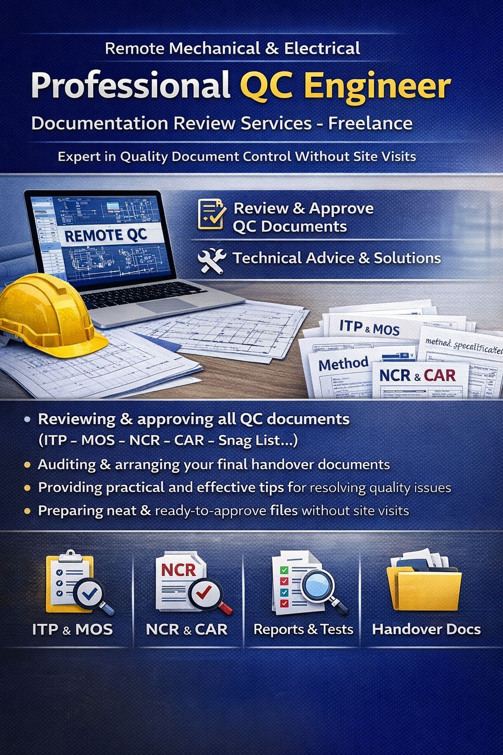 مهندس QC ميكانيكا وكهرباء يقدم خدمات مراجعة مستندات الجودة عن بعد بدون زيارة موقع. يشمل تدقيق واعتماد ITP & MOS, NCR & CAR، مراجعة التقارير والاختبارات، تجهيز ملفات التسليم النهائي، وتقديم استشارات وحلول فنية لتحسين الجودة وترتيب الملفات بشكل احترافي وجاهز للاعتماد