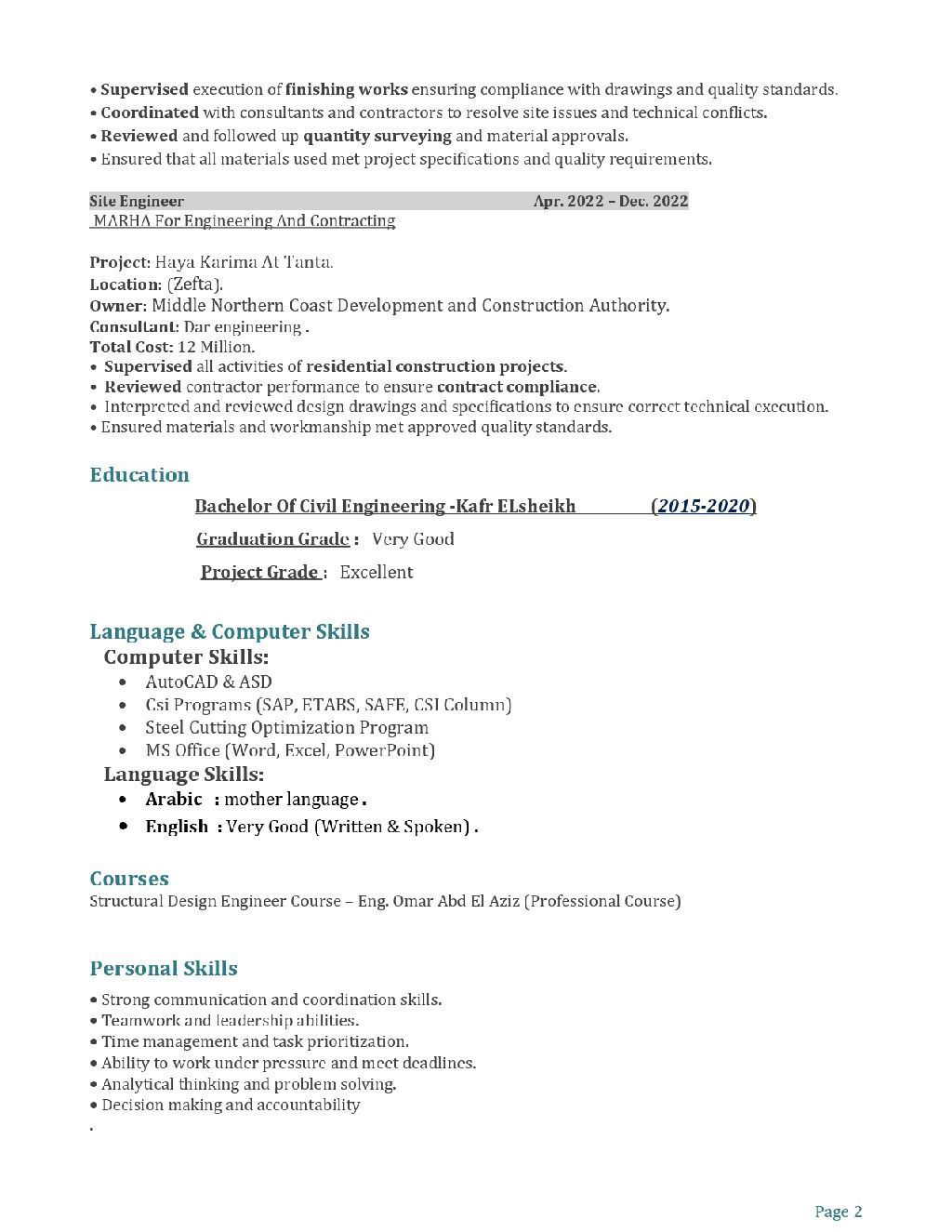 مهندس مدني بخبرة أكثر من 5 سنوات في أعمال الموقع والمكتب الفني، ابحث عن فرصة عمل مهندس موقع / مهندس مكتب فني مدني. لدي خبرة عملية في الاشراف والتنفيذ بالموقع لأعمال الخرسانة المسلحة والتشطيبات مراجعة وتنفيذ الرسومات التنفيذية (Shop Drawings) الحصر والكميات وBOQs المستخلصات، التغييرات، وتقارير الموقع التنسيق مع الاستشاري، المقاولين، ومهندسي الموقع العمل في مشروعات سكنية ومشروعات انشائية كبيرة