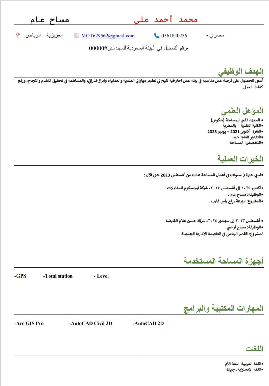 مساح عام خريج معهد مساحة حكومي عضو لدى الهيئة السعودية للمهندسين أتقن العمل على جميع الاجهزة level, Total station, Gps والبرامج Atou Cad 2d, civil 3