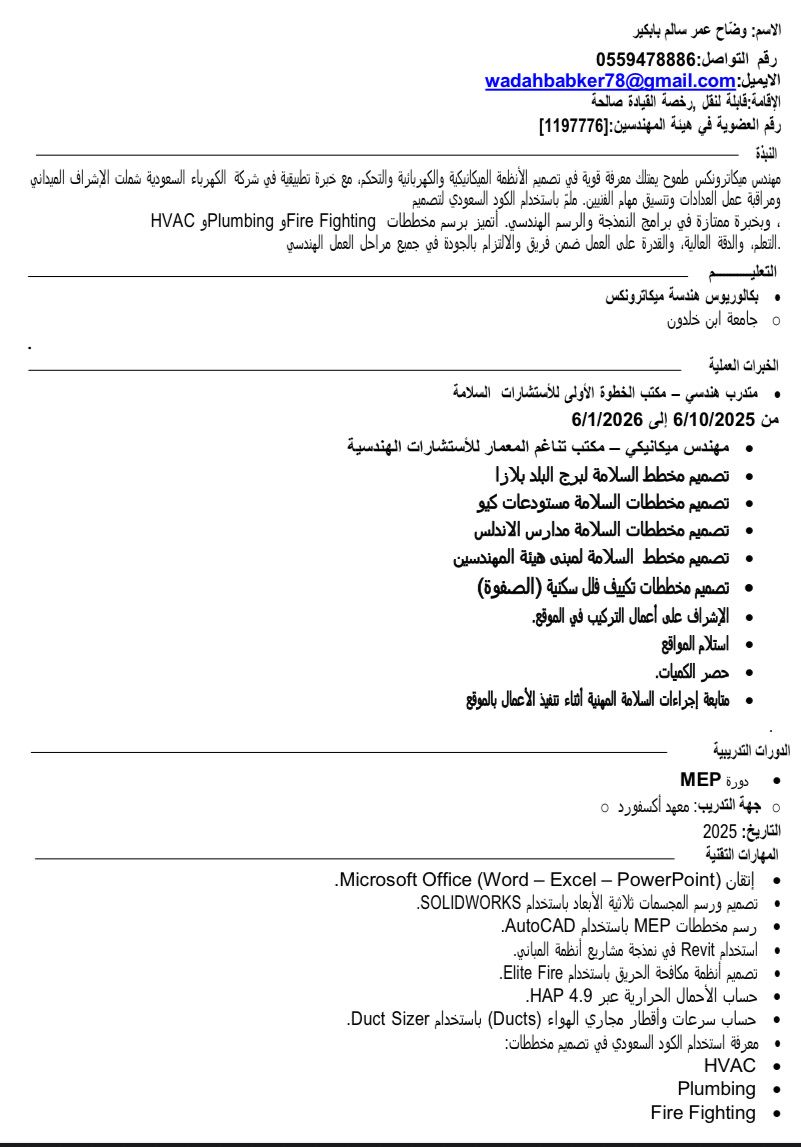 مهندس ميكانيك متواجد فيجدة بخبرة سنة ونصف في مجال المقاولات الكهروميكانيكية (MEP) متمكن من المهام التالية 1. تجهيز ورسم مخططات التكييف ومكافحة الحريق بدقة عالية. 2. الاشراف المباشر على التنفيذ في المواقع وضمان مطابقة المواصفات. 3. حصر الكميات ومتابعة سير الأعمال. الخبرة سنة ونصف. الحالة متاح لنقل الكفالة / أو للعمل الفوري