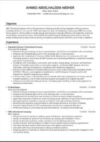مهندس كهرباء (MEP) بخبرة عملية في قيادة وتنفيذ أنظمة المباني المتكاملة، تشمل الأنظمة الكهربائية، التيار الخفيف، التكييف، السباكة، انذار ومكافحة الحريق، الغازات الطبية، أنظمة إدارة المباني (BMS) وأنظمة البيوت الذكية. أتميز بالقدرة على الربط بين التصميم والتنفيذ، وقيادة فرق العمل، وضبط الجودة والتنسيق بين التخصصات لضمان تسليم المشاريع بكفاءة عالية ووفق أعلى المعايير الفنية والزمنية