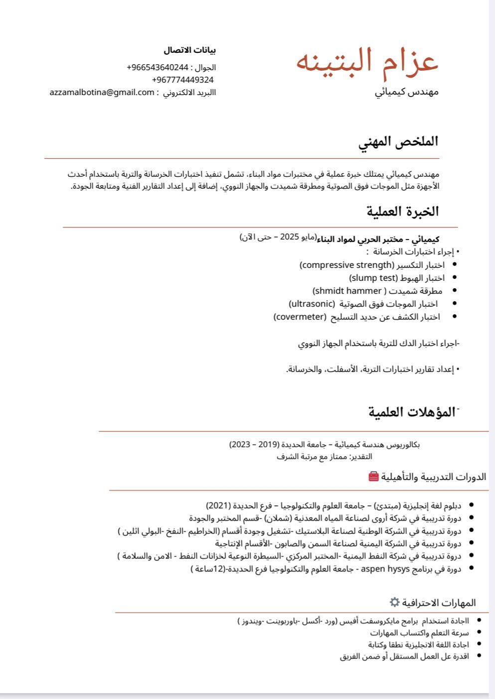 مهندس كيميائي حديث التخرج حاصل على بكالوريوس هندسة كيميائية، اشتغلت في مختبر تربة واسفلت وخرسانة، وامتلك خبرة تدريبية في مراقبة الجودة وتشغيل العمليات الصناعية واعداد التقارير الفنية. لديه مهارات في استخدام برامج الأوفيس والعمل ضمن فريق. يبحث عن فرصة وظيفية في قسم الهندسة لتطوير المهارات والمساهمة في تحسين الأداء التشغيلي
