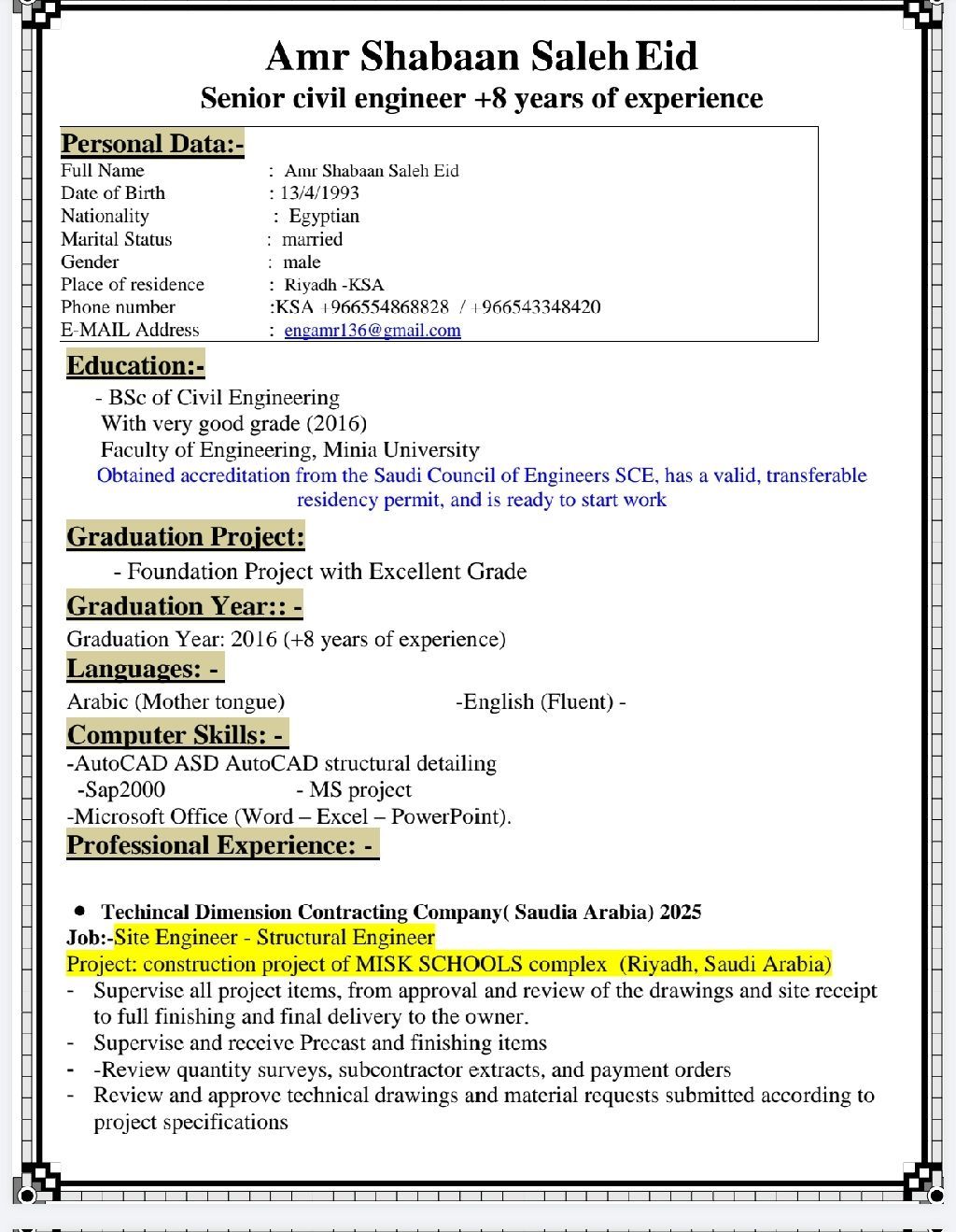 مهندس مدني تنفيذ خبرة 10 سنوات في أعمال الخرسانات والتشطيبات متواجد ة في الرياض ومستعد للعمل في جميع أنحاء المملكة وأحمل أقامه سارية ورخصة قيادة وعضو هيئة المهندسين السعوديين