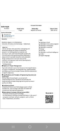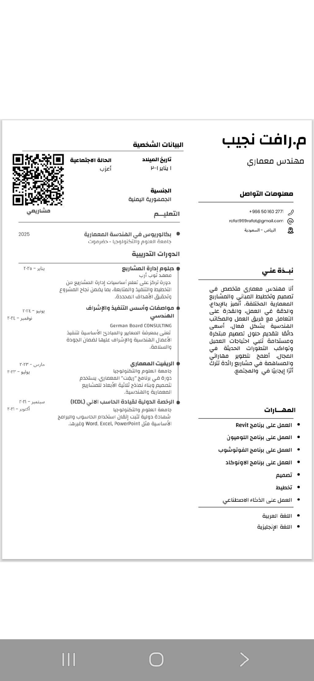 حديث تخرج هندسة معمارية متقن برامج الهندسة المعمارية. الرفيت اللميون الاوتوكاد أيضا عندي دورات في الاشراف الهندسي ومعي بطاقة هيئة المهندسين ومعي مشروع منفذ واجهات محل في مدينة الطائف ومشاريع الجامعة ومشروع الواجهات حق مدينة الطائف موجود داخل الباركود