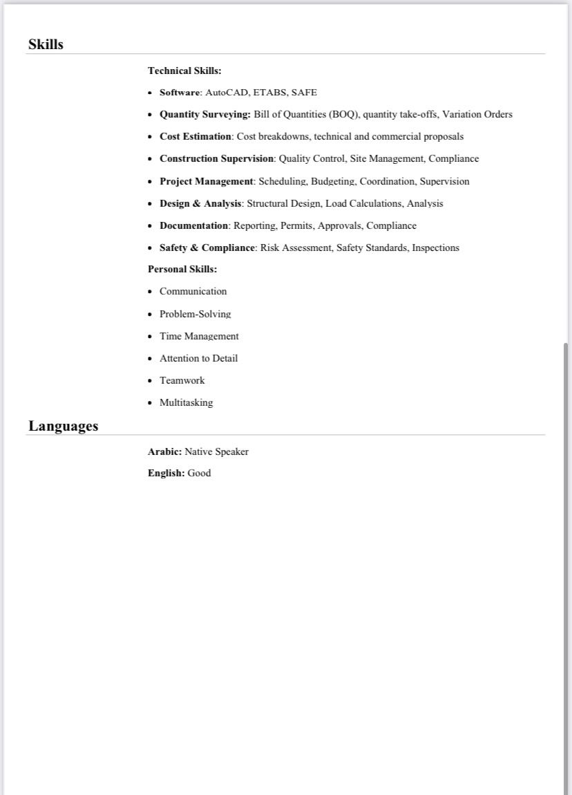 مهندس مدني بخبرة في (حاسب كميات - التسعير - التنفيذ) خبرة في حصر الكميات واعداد BOQ والمستخلصات وأوامر التغيير، مراجعة المخططات والمواصفات وكراسات الشروط (RFP / ITT) اعداد وتحليل Cost Breakdown، التسعير (Direct & Indirect Costs) اعداد العروض الفنية والمالية، التنسيق مع المشتريات وطلبات الأسعار، الرد على استفسارات المناقصات، متابعة التنفيذ بالموقع واستلام أعمال مقاولي الباطن