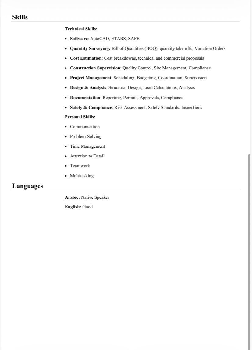 مهندس مدني بخبرة 7 سنوات في (حساب الكميات، التسعير، والتنفيذ) خبرة في حصر الكميات واعداد BOQ والمستخلصات وأوامر التغيير، مراجعة المخططات والمواصفات وكراسات الشروط (RFP / ITT) اعداد وتحليل Cost Breakdown وتسعير Direct & Indirect Costs، تجهيز العروض الفنية والمالية، التنسيق مع المشتريات لطلبات الأسعار، الرد على استفسارات المناقصات، ومتابعة التنفيذ واستلام أعمال مقاولي الباطن