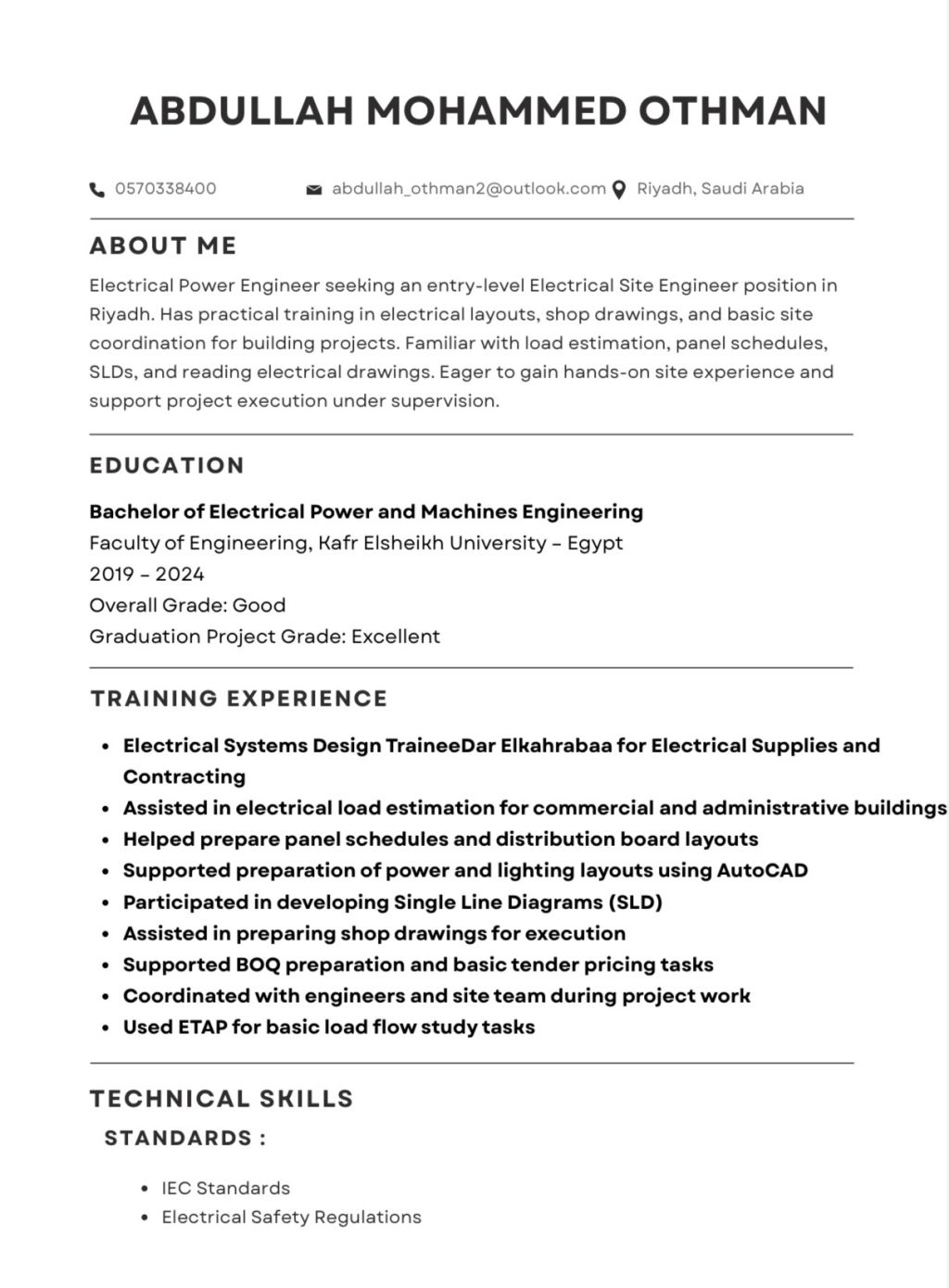 مهندس كهرباء متواجد حاليا في الرياض، ابحث عن فرصة عمل في مجال الأعمال الكهربائية ضمن مشاريع أل MEP داخل شركة مقاولات، للعمل في الموقع أو المكتب الفني. خبرة من 0 الى 1 سنة، اجادة قراءة المخططات والرسومات الكهربائية، معرفة بأساسيات أعمال الموقع لمشاريع أل MEP (انارة - قوى - تمديدات - لوحات) متابعة التنفيذ واستلام الأعمال طبقا للمخططات، سريع التعلم وجاد في العمل وجاهز للانضمام فورا