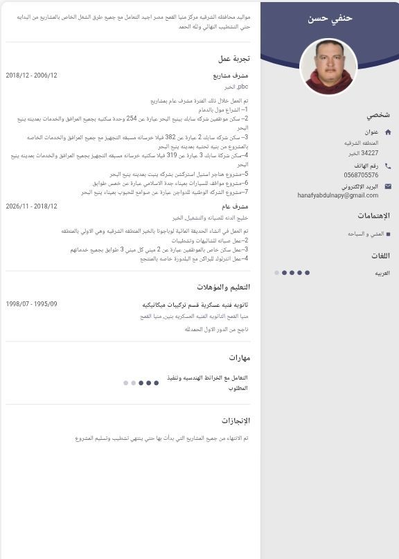 مشرف عام مدني ومعماري المهنة بالإقامة فني هندسة مدنيه سارية ولدي رخصة خاصه خبرة 19 سنة الحمدلله ما بين ينبع البحر وجدة والدمام والخبر