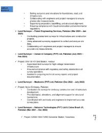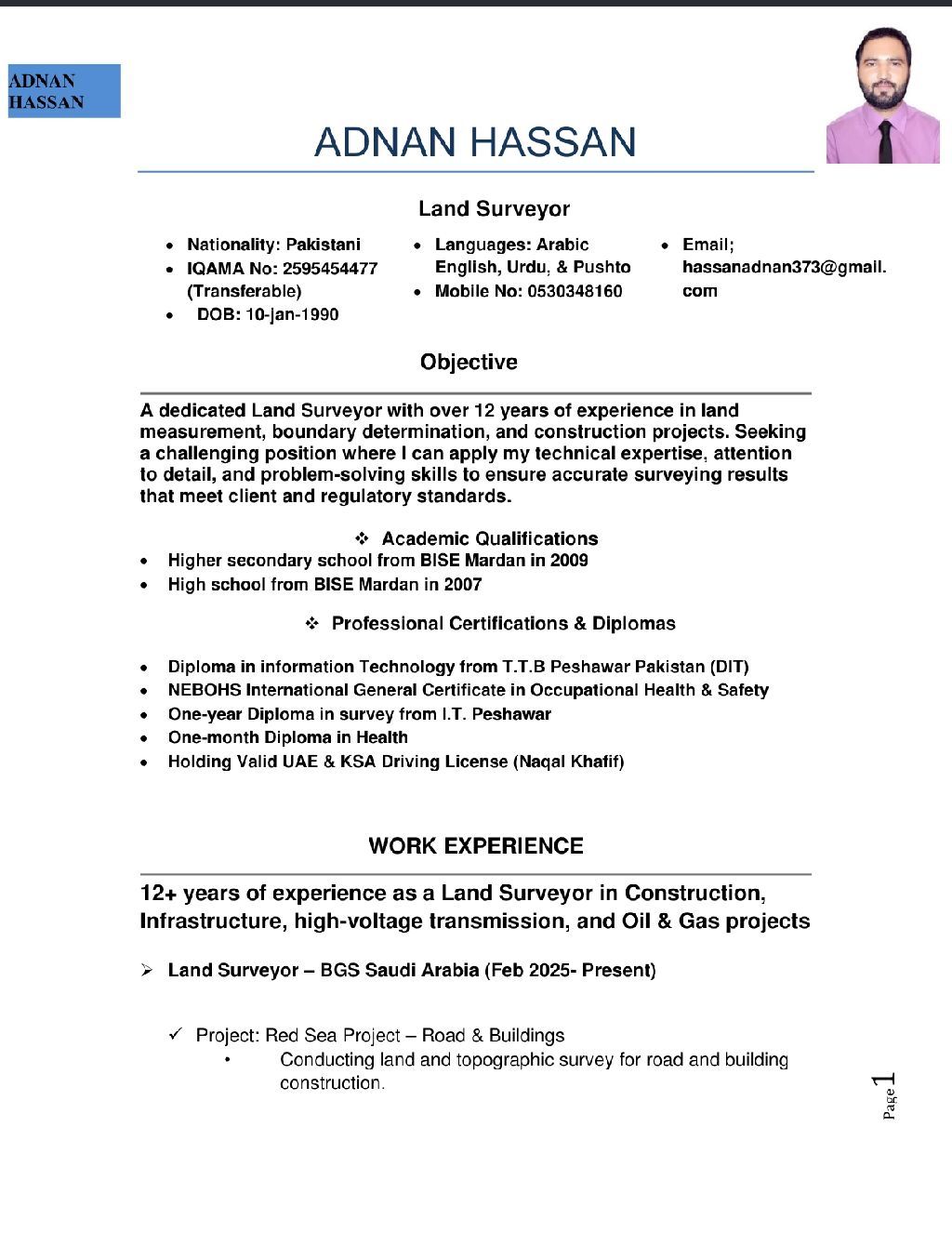 أنا مساح أراضي ومسؤول سلامة، ولدي خبرة 13 عاما في مجالات الإنشاءات، وخطوط نقل الطاقة، والمحطات الفرعية، وأعمال الحفر، والبنية التحتية للطرق، والمباني، وخطوط الأنابيب
