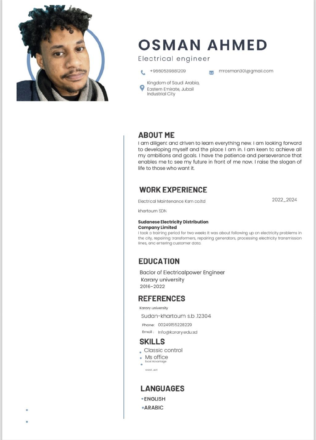 خريج بكالوريوس هندسة كهربائية 2022 سوداني العمر 28 عام خبرة عامان متواجد في المنطقة الشرقية الجبيل