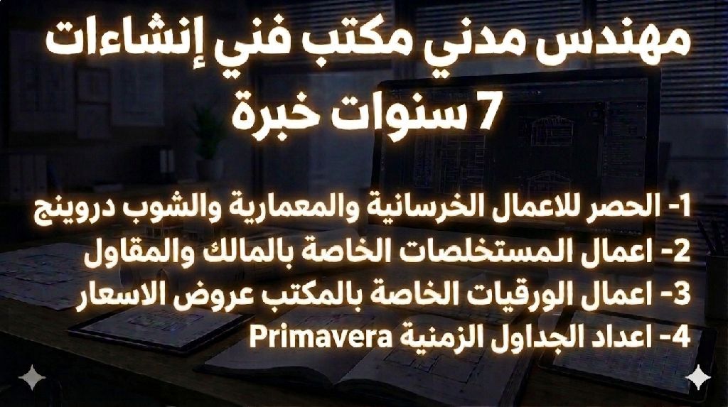 مهندس مدني مكتب فني خبرة + 7 سنوات في مجال الإنشاءات لديه خبرة قوية في حصر الكميات للأعمال الخرسانية والمعمارية واعداد الشوب دروينج واعداد المستخلصات الخاصة بالمالك والمقاول وتجهيز مستندات المكتب الفني وعروض الأسعار بالاضافة الى اعداد ومتابعة الجداول الزمنية للمشروعات باستخدام برنامج Primavera، مع قدرة عالية على التنظيم والدقة في العمل
