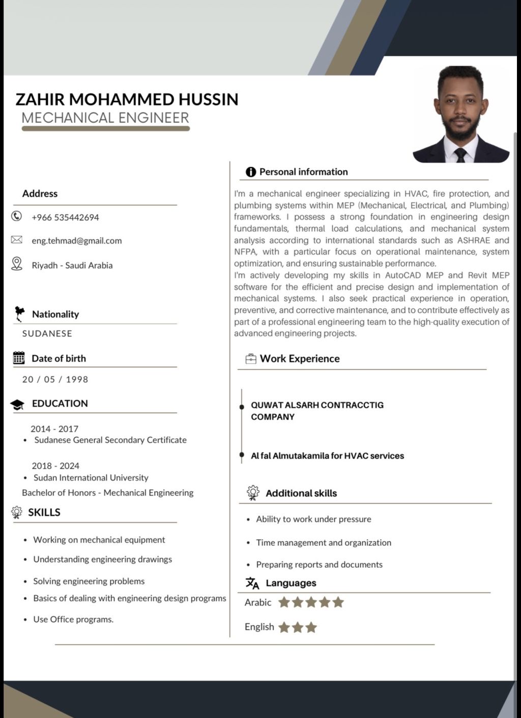 مهندس ميكانيكي متخصص في مجال التكييف والتبريد وأنظمة اطفاء الحرائق وأعمال السباكة امتلك معرفة جيدة بأساسيات التصميم الهندسي وحساب الأحمال الحرارية وتحليل الأنظمة الميكانيكية وفقا للمعايير العالمية مثل ASHRAE وNFPA مع اهتمام خاص بجانب الصيانة التشغيلية ورفع كفاءة الأنظمة وضمان استدامة أداءها