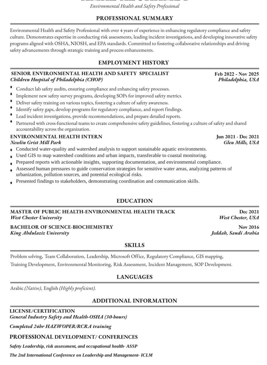 حاصلة على درجة الماجستير في الصحة العامة بتخصص صحة بيئة وأمن وسلامة من جامعة West Chester في الولايات المتحدة، بمعدل عالي. لدي خبرة تزيد عن أربع سنوات في مجال السلامة والصحة المهنية والبيئية وجودة المياه، مع خبرة في تقييم المخاطر، والالتزام بأنظمة ولوائح السلامة مثل، OSHA, NIOSH, وEPA، بالاضافة الى تقديم برامج تدريبية في مجال السلامة والصحة المهنية. أملك شهادات مختلفة في OSHA, HAZOPER. أمل عبدالله