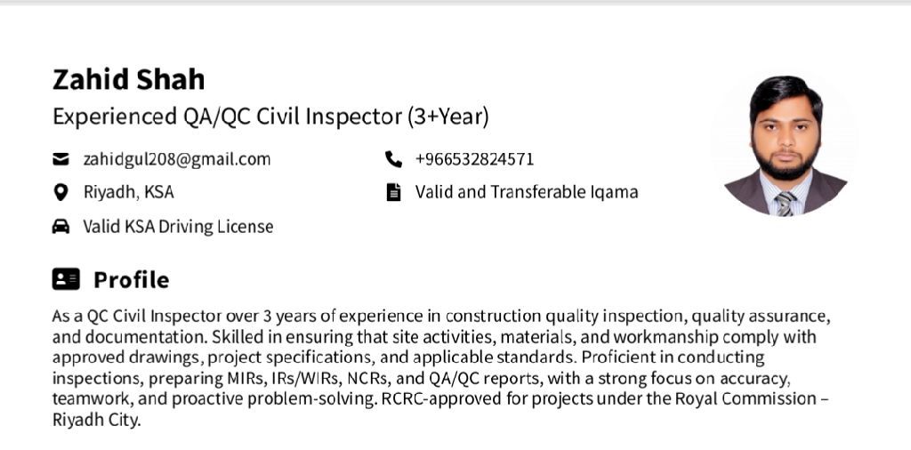 مفتش ضمان ومراقبة جودة مدنية (QA / QC Civil Inspector) بخبرة تزيد عن 3 سنوات في فحص جودة البناء، وضمان الجودة، واعداد الوثائق. متخصص في إجراء عمليات التفتيش الميدانية ومراجعة الرسومات المعتمدة ومواصفات المشروع والمعايير الهندسية لضمان الامتثال. متمكن في اعداد وإدارة تقارير MIRs وIRs / WIRs وNCRs وتقارير QA / QC والمستندات الخاصة بالجودة. ماهر في اختبار المواد والتحقق من جودة الأعمال وتنفيذ بر وتوكوا