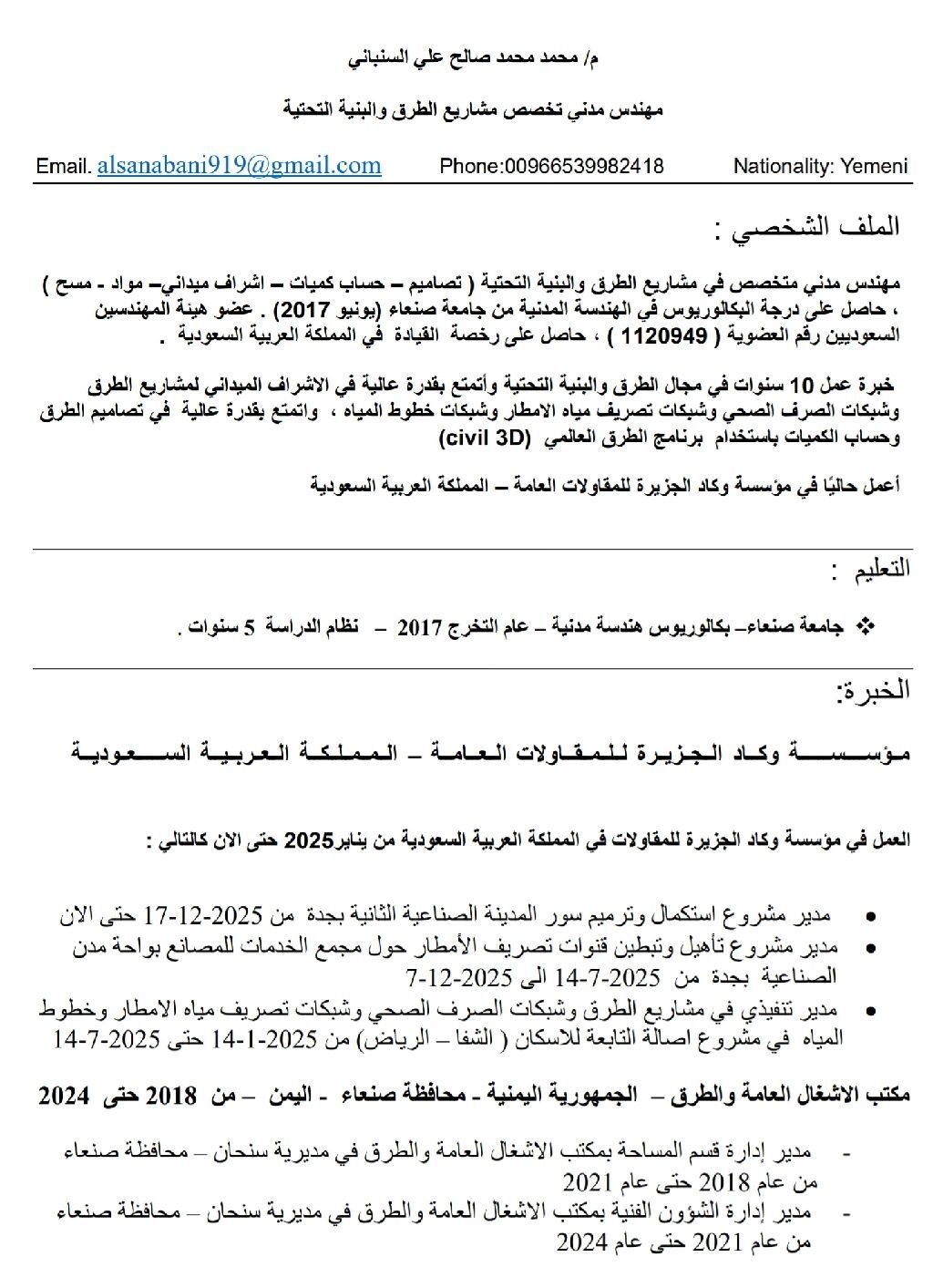 مهندس مدني خبرة عمل 10 سنوات خبرة عمل في السعودية لمدة سنة ونصف عملت مدير مشروع ل 2 مشاريع حكومية في السعودية، متخصص في الاشراف على مشاريع الطرق والبنية التحتية وحساب الكميات خصوصا مشاريع الصرف الصحي وشبكات تصريف مياه الأمطار وشبكات المياه والاشراف الموقعي لجميع الأعمال الهندسية لمشاريع البناء والاستشارات الهندسية حاصل على عضوية المهندسين السعوديين حاصل على رخصة القيادة في المملكة العربية السعودية
