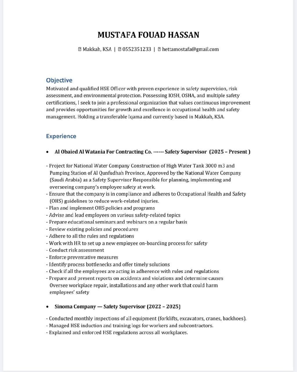 مراقب أمن وسلامة وصحة مهنية (HSE) بخبرة تتجاوز 5 سنوات في مواقع العمل، حاصل على شهادات OSHA وIOSH وبكالوريوس نظم معلومات. معتمد من شركة المياه الوطنية (القطاع الغربي والقطاع الجنوبي) خبرة قوية في تقييم المخاطر، اعداد تقارير السلامة، متابعة تطبيق الاجراءات، وتدريب العاملين لرفع الوعي وتقليل الحوادث. لدي القدرة على العمل تحت ضغط واتخاذ القرارات السريعة بكفاءة. إقامة سارية وجاهز للنقل والعمل فورا