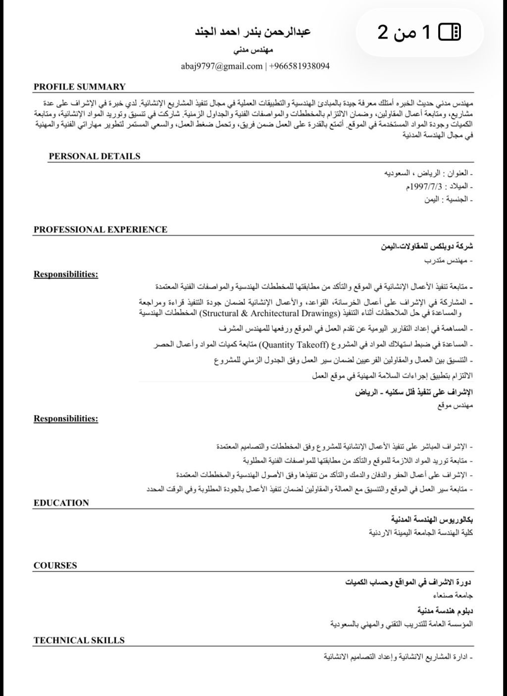 مهندس مدني حديث الخبرة يبحث عن فرصة عمل لدي خبرة عملية في الاشراف على تنفيذ الفلل السكنية في مدينة الرياض الاشراف على أعمال الهيكل الانشائي والتشطيب - متابعة سير العمل في الموقع والتأكد من الجودة أسعى للحصول على فرصة عمل لتطوير مهاراتي واكتساب خبرة أكبر في مجال الهندسة المدني التواصل الموقع الرياض