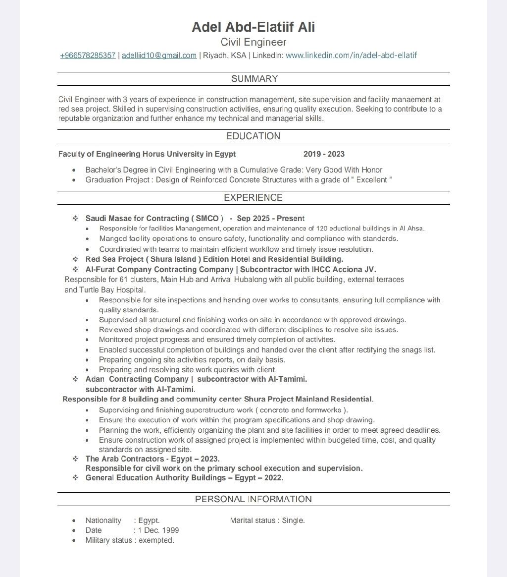 مهندس مدني مصري سبق العمل في مشروع البحر الأحمر RSG في جزيرة شورى خبرة 3 سنوات في الانشاءات والتشطيبات وصيانة المباني التعليمية TBC في مدينة الاحساء. ابحث عن عمل في أي مكان في المملكة وجاهز للعمل فورا. إقامة سارية مع وجود رخصة قيادة