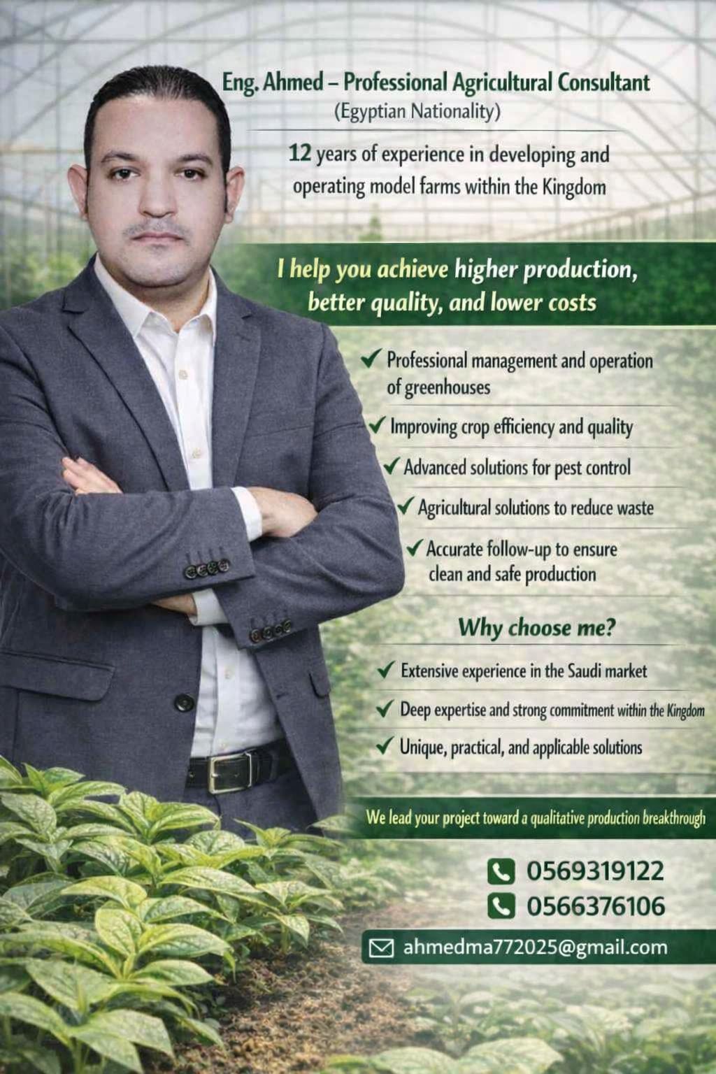 أنا مهندس زراعي خبرة 12 عام في انتاج الخضار محمى ومكيف ومكشوف في السعودية والاسمدة والمبيدات والبذور ومسجل بالهيئة السعودية للمهندسين SCE