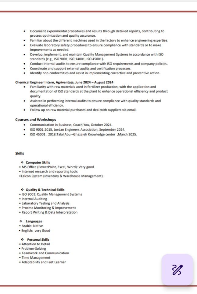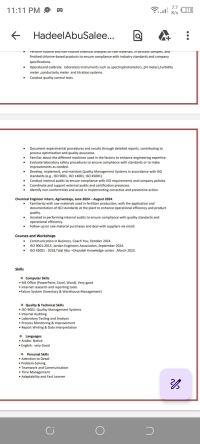أنا هديل أبو سليم، من الأردن، عمري 24، مهندسة كيميائية من الجامعة الأردنية، لدي خبرة سنة مهندسة جودة في الشركة الوطنية للكلورين، حاليا اشتغل مهندسة مشتريات في شركة اليسار لمستحضرات البحر الميت، ومعي شهادة أل iso 9001، iso 45001 وأتأمل للعمل في السعودية وجادة للعمل على الفور