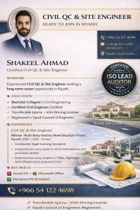 مهندس مدني طموح يمتلك خبرة تزيد عن 7 سنوات كمهندس ضبط جودة ومهندس موقع مدني. حاصل على بكالوريوس في الهندسة المدنية، SCE ® وشهادة ISO Lead Auditor، وPMP. يعمل حاليا في مشروع مصنع الفنار متعدد الأدوار للهيكل الفولاذي. يمتلك خبرة واسعة في مشاريع الفلل والهياكل الفولاذية والبنية التحتية. لديه اقامة قابلة للتحويل ورخصة قيادة سعودية. متاح للمقابلة والانضمام فورا بشكل فوري دون تأخير